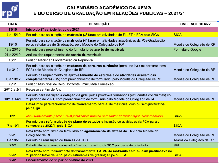 O Colegiado de RP divulga o calendário para o semestre de 2021/2. Fique atento às datas importantes!