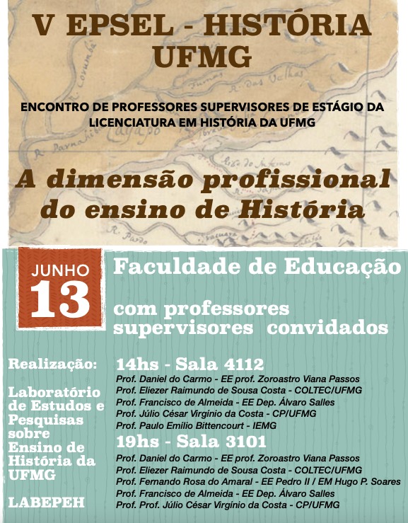 No dia 13 de junho de 2023, acontecerá o V Encontro de Professores e Supervisores de Estágio da Licenciatura em História, organizado pelos professores da Faculdade de Educação da UFMG. A atividade é aberta a interessados.