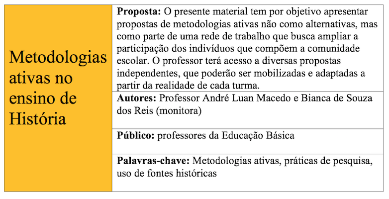 No âmbito desse programa, estudantes do curso de história atuaram como bolsistas e/ou voluntários, desenvolvendo materiais diversos, voltados para professores e estudantes da Educação Básica: sites, atividades com fontes e recursos audiovisuais, perfis no Instagram, glossários, coletâneas etc. Esses materiais são disponibilizados agora e são de acesso livre. Nosso objetivo é que ele seja uma contribuição aos professores em atuação na Educação Básica, que poderão mobilizá-los e apropriá-los na produção de suas aulas.