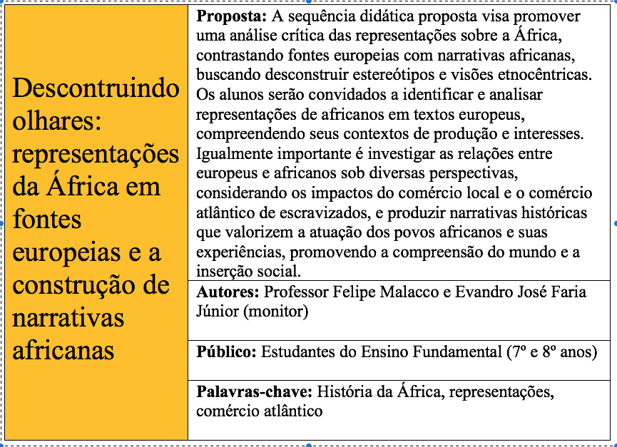 No âmbito desse programa, estudantes do curso de história atuaram como bolsistas e/ou voluntários, desenvolvendo materiais diversos, voltados para professores e estudantes da Educação Básica: sites, atividades com fontes e recursos audiovisuais, perfis no Instagram, glossários, coletâneas etc. Esses materiais são disponibilizados agora e são de acesso livre. Nosso objetivo é que ele seja uma contribuição aos professores em atuação na Educação Básica, que poderão mobilizá-los e apropriá-los na produção de suas aulas.