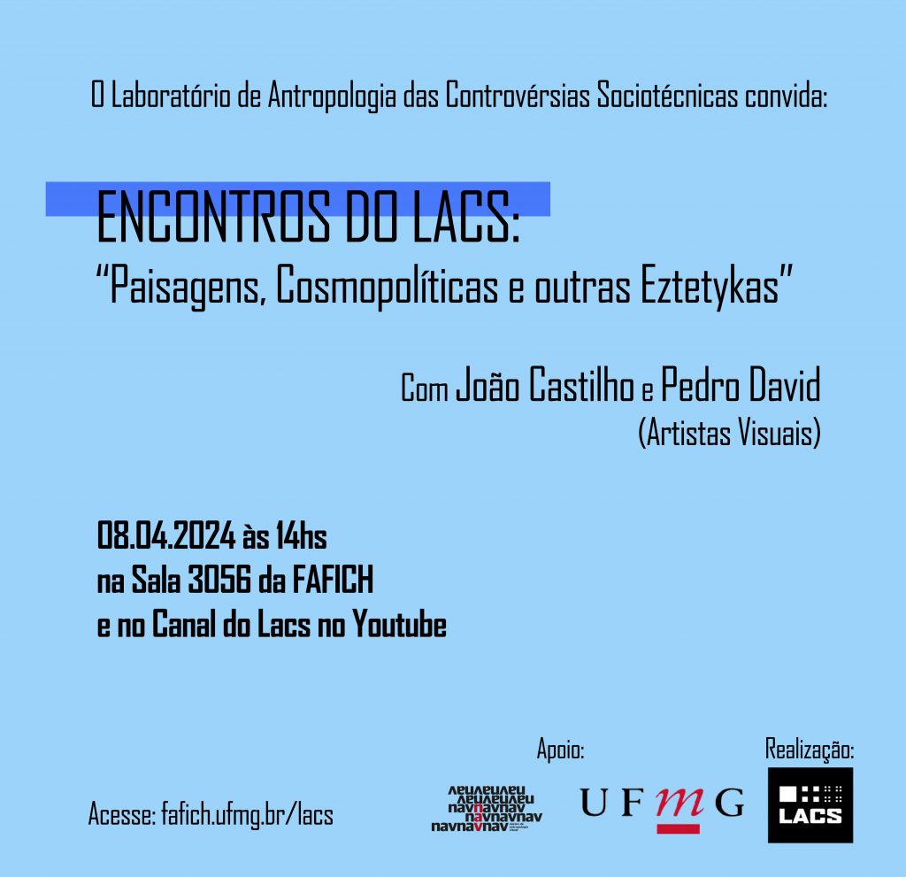 O Laboratório de Antropologia das Controvérsias Sociotécnicas da UFMG convida a todas e todos para o próximo Encontro do LACS! Este é um espaço de conversa, encontros e trocas entre o LACS e diversas pesquisadoras(es) convidadas(os). No próximo dia 08/04 receberemos para essa conversa os artistas visuais João Castilho e Pedro David.