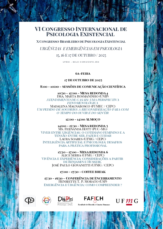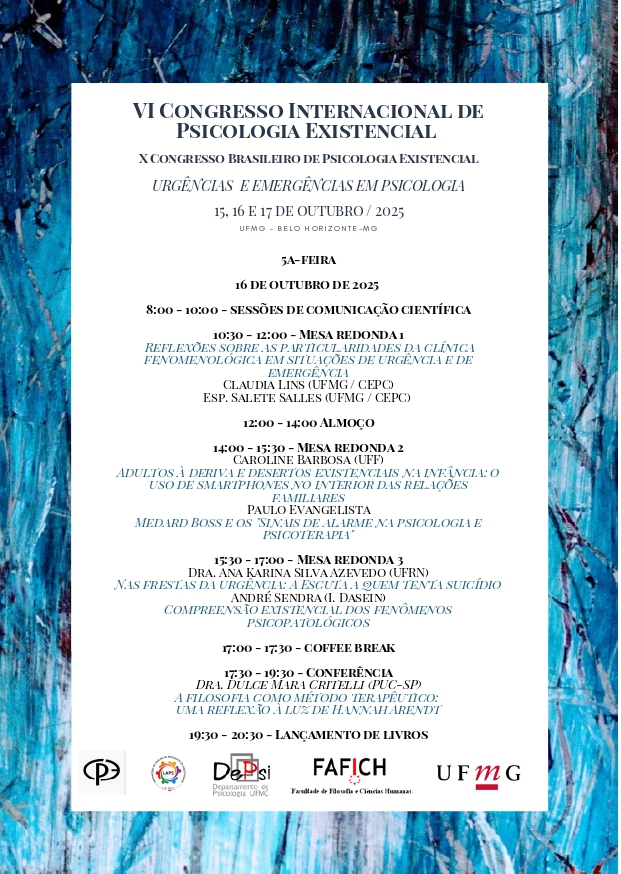 O congresso visa difundir conhecimentos e produção na área da Psicologia Existencial, destacando sua base filosófica e os vários campos de atividade do psicólogo que se consagra a essa abordagem, contribuindo para o desenvolvimento desta abordagem em psicologia e para a prática profissional daqueles que a elegeram como fundamento de seu trabalho. Objetiva ser ocasião de que estudantes de graduação e pós-graduação possam apresentar suas pesquisas e discutir com pares, promovendo intercâmbio de ideias.